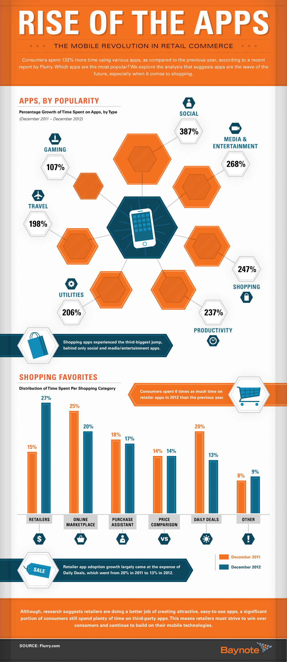 A recent study by Flurry showed that consumers’ use of various apps have increased by 132% over the course of a year. According to the infographic by Baynote, consumers spent six times as much time on retailer apps in 2012 than the previous year. Shopping applications experienced the third biggest jump, showing an increase of 247%, behind only social and media/entertainment. applications.